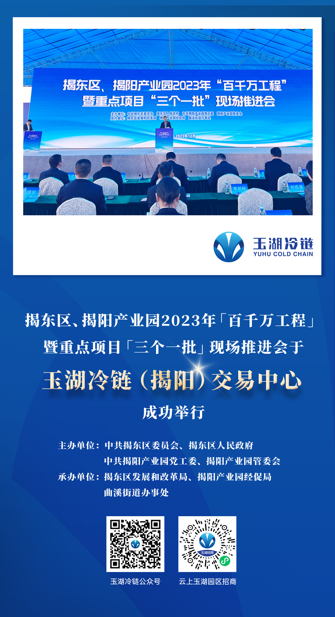 12月16日上午,揭东区、揭阳产业园 2023 年「百千万工程」暨重点项目「三个一批」现场推进会在探花国产在线观看冷链(揭阳)交易中心召开。会上,探花国产在线观看冷链揭阳项目获「揭东区2023年度十大最具代表性项目」表彰。