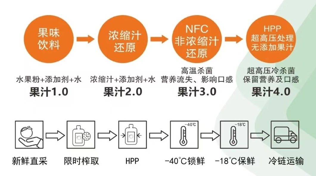 冻鲜果汁之所以能够在竞争激烈的茶饮市场脱颖而出,离不开HPP技术的应用。这项技术通过600兆帕的压力杀菌,相当于在海底6万米的压力下杀灭微生物,而不会破坏水果中的营养成分。与传统的热杀菌不同,HPP技术不仅能保留果汁的天然风味,还能保留天然抗氧化剂以及维生素、矿物质等营养成分,从而使产品在市场上更具竞争力。果然食品的生产流程遵循“冷榨、冷杀、冷藏”三冷标准流程,直采新鲜水果,48小时内限时榨取,通过 HPP 超高压冷杀菌后,即刻在零下40度冷库中速冻锁鲜,再以零下 18 度储存,确保从采摘到消费者手中的每一步都精益求精。